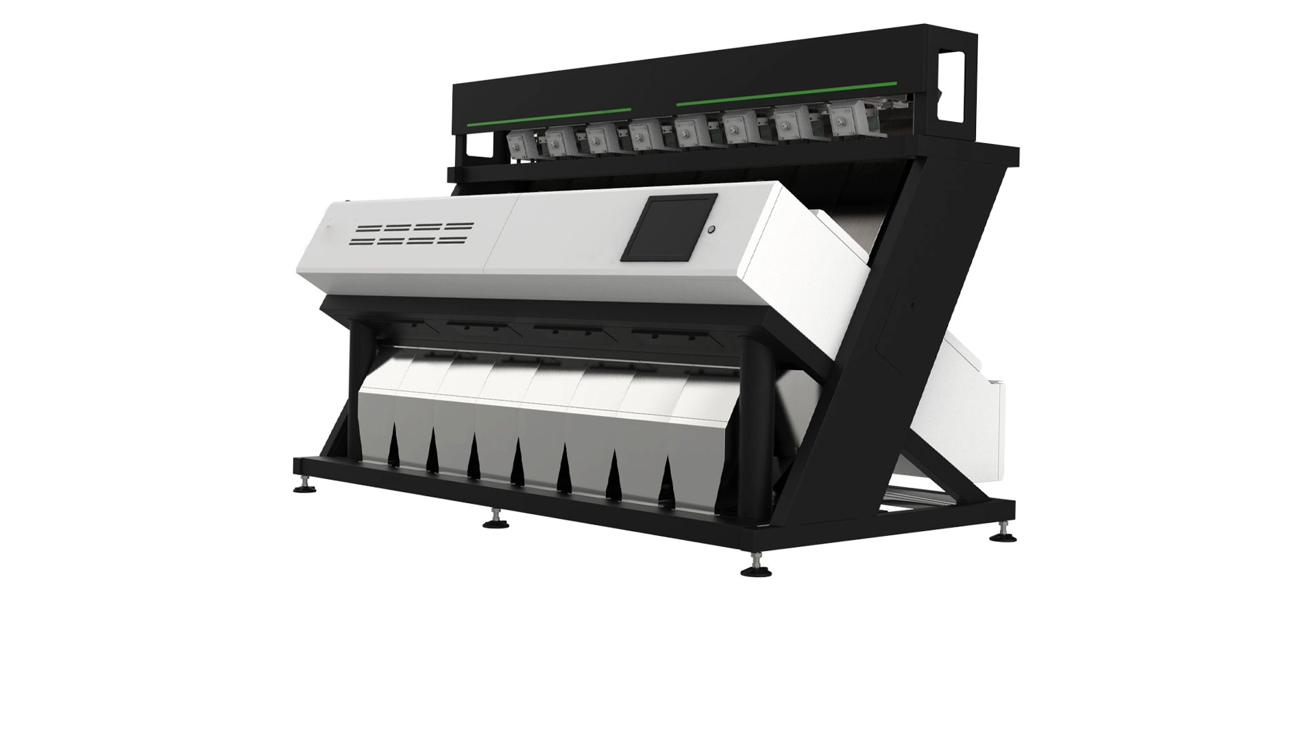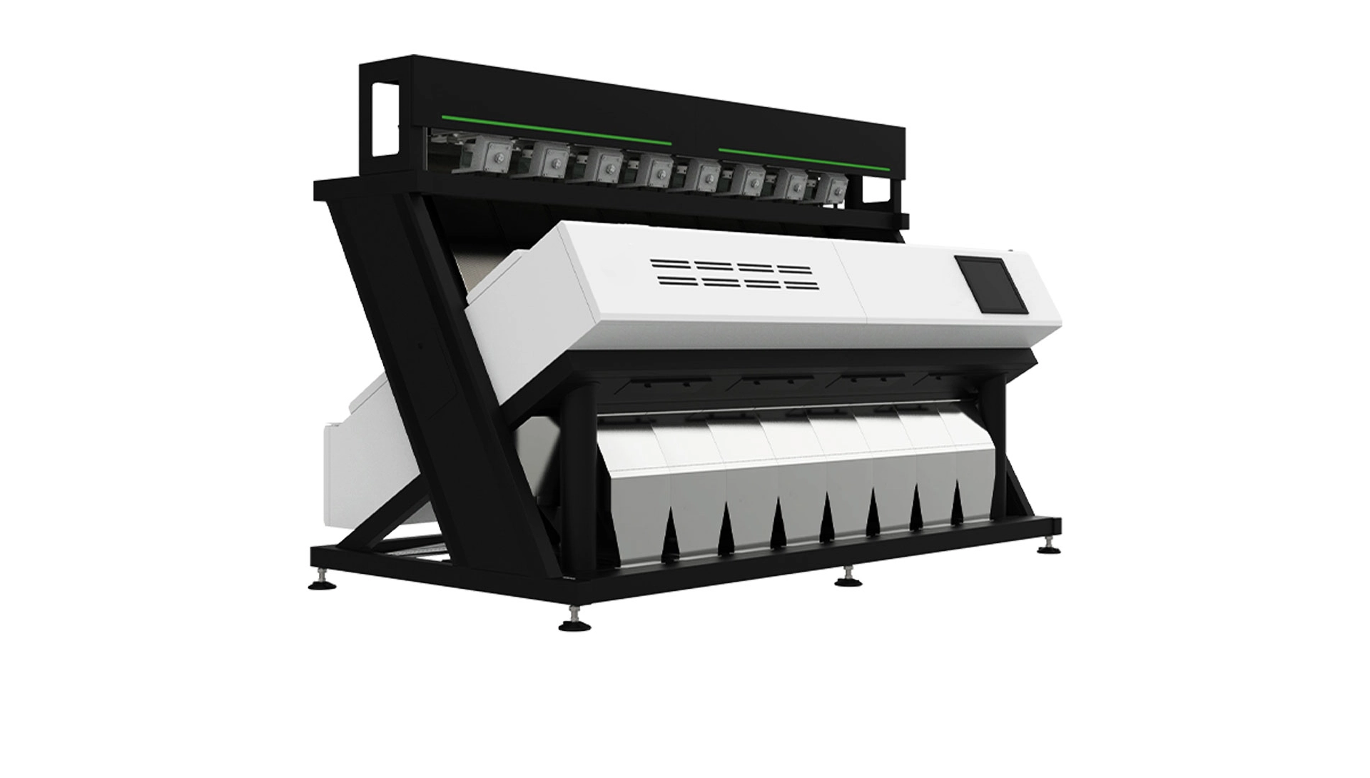 Each module will be equipped with a two-way vision system. The machine will have doors visible from the front inspection area, allowing for the control of accepted and rejected product flow. The machine, with independent precision control and purification techniques for any type of spot damage, will be capable of distinguishing between colors or defects. We have used two 5400 CCD cameras in each channel.